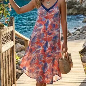 Midi dress for women from ROXY. Features include: printed design, midi length, T-back strap detail and shirt tail hem.