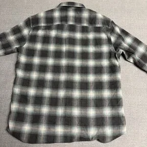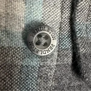 Pendleton Thomas Kay Collection button-down shirt. Classic plaid pattern in shades of grey, cream, and light blue. It is made from 100% cotton with a soft, brushed texture. The shirt includes a button-down collar, a single chest pocket, and branded Pendleton buttons. Size medium & EUC!