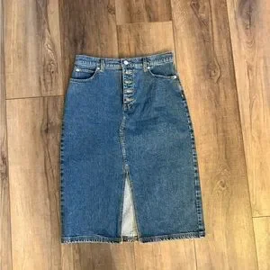 Structured high-waist denim skirt from Banana Republic. Front button closure and center slit. Classic blue wash with contrast stitching. Sleek, versatile silhouette.