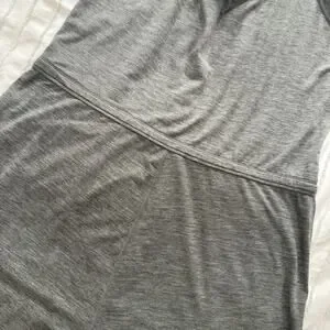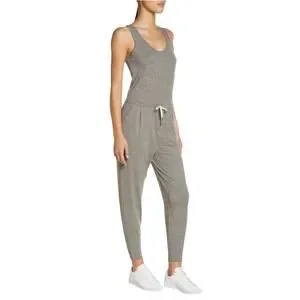 Soft heather gray Vuori Lux harem jumpsuit in women’s medium featuring scoop neck, relaxed drop-crotch silhouette, elastic drawstring waist, side pockets, and ultra-soft stretch knit performance fabric perfect for athleisure, yoga, lounge, travel, minimalist capsule wardrobe, and casual everyday wear.