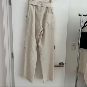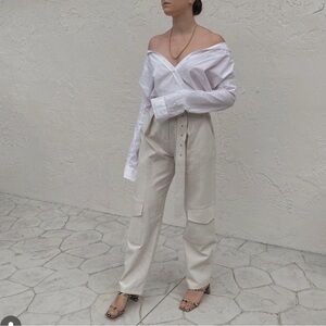 Straight-leg cargo pants with flap pockets and a matching belt. Clean cream tone for a minimal look. High waist and tailored seams for structure. Easy to style for day or night.