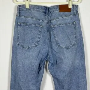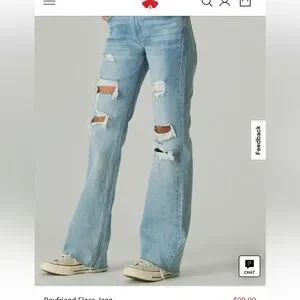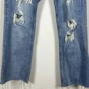 light wash, distressed, pockets, zipper button closure, mid rise, flare, frayed hem, little stretch. Excellent preloved condition with no flaws.