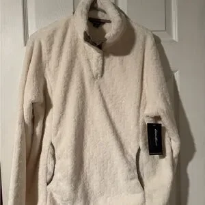 Soft fleece pullover. Cozy and warm. Features a high collar and front pocket.