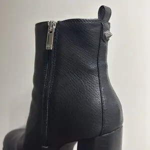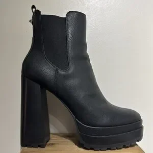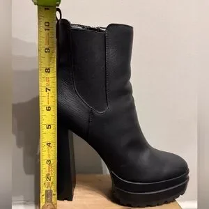 These stylish black heeled boots feature a chunky high 5inch heel and a noticeable platform sole for added height. Made from a leather-like material with a textured finish, they offer a modern look and comfortable fit with a rounded toe shape and inner zipper for easy wear.