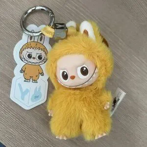 It’s a tiny, fluffy collectible with soft grey fur, iconic bunny ears, and Labubu’s signature mischievous grin.