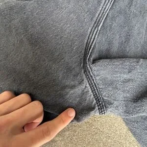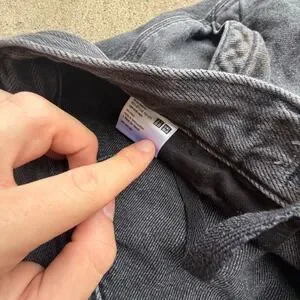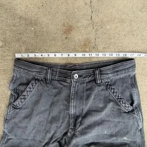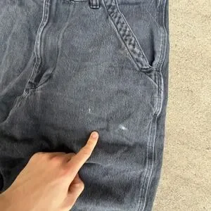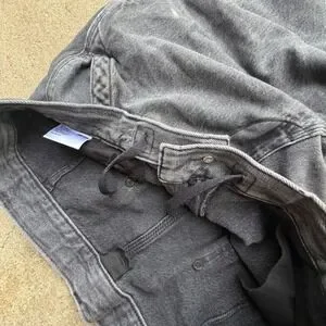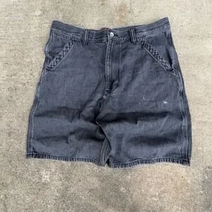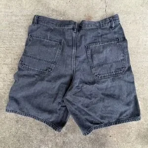 Uniqlo denim utility shorts in a washed black finish offer a rugged yet comfortable aesthetic. Crafted from 100% cotton, these shorts feature a functional drawstring waist for an adjustable fit, classic carpenter-style slanted front pockets with reinforced stitching, and a relaxed silhouette. The heavyweight denim provides durability, while the faded wash gives them a lived-in, vintage look. Note that there are some minor white paint-like marks on the front thigh area as shown in photos.