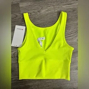 Lululemon Bright neon yellow ribbed crop tank top with a fitted silhouette. Smooth stretch fabric offers comfortable support and all-day wear. Stylish scoop neckline and wide straps for easy layering. Ideal for casual looks and active days.