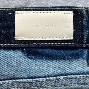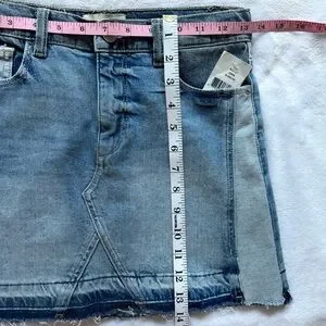 DL1961 denim mini skirt with reverse denim paneling.
