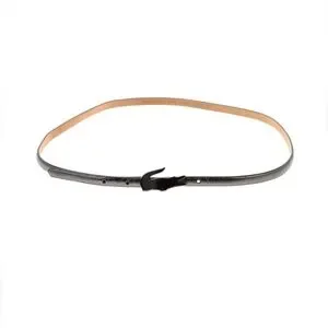Sleek black belt with tan interior. Features iconic Lacoste logo buckle. Perfect for versatile styling.
