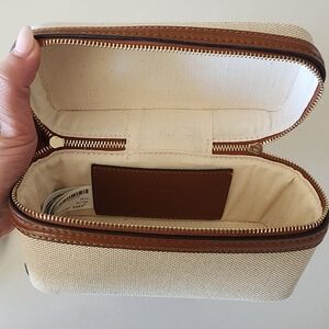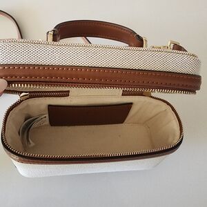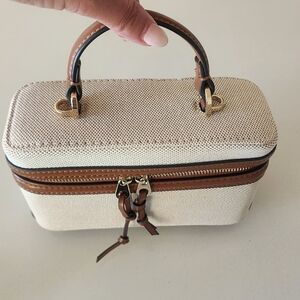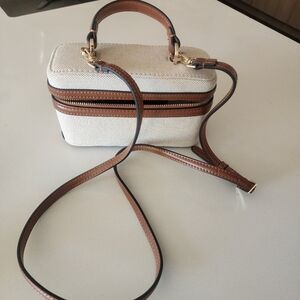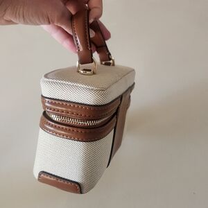 Zara lunchbox structured bag, often styled as a vanity or crossbody purse featuring a structured design, top handle, and adjustable shoulder strap. Stylish handbag features a sophisticated tan and cream design, perfect for any occasion. Its elegant look is complemented by high-quality materials, making it a must-have accessory.