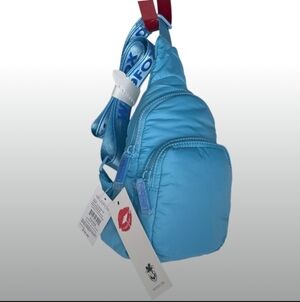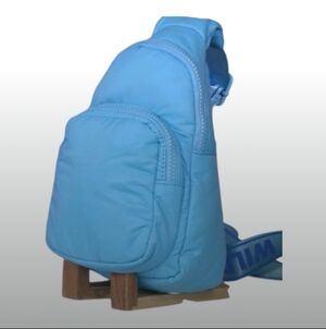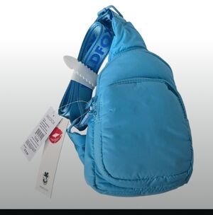 Sleek Wildfox sling bag in vivid aqua blue. Padded nylon exterior with smooth finish. Front zip pocket and easy-access main compartment. Adjustable branded shoulder strap for comfortable wear.