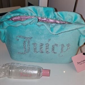Juicy Couture cosmetic bag. Soft turquoise exterior with ruffled top. Jeweled "Juicy" logo on front. Zippered closure. Stylish and playful design.