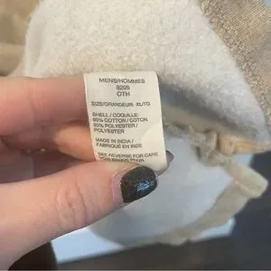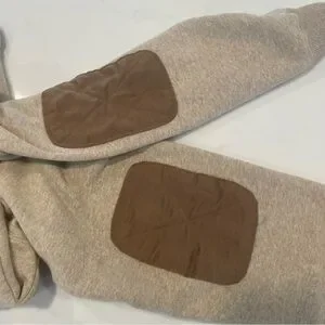 Stylish Woolrich sweater. Beige body with brown elbow patches. Quarter-zip design. Comfortable and warm.