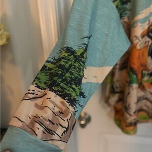 Bold Roy Rogers cowboy and horse graphic pullover. Dominant teal and tan colorway with orange and cream accents. Lightweight, relaxed fit. Statement western print for casual wear.