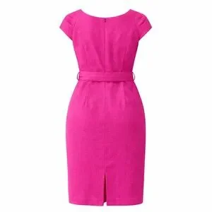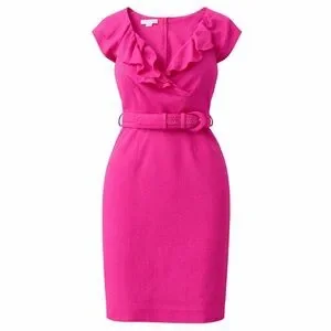 Elegant Kay Unger New York silk sheath dress in vibrant pink. This classic tailored dress features a feminine ruffle neckline, cap sleeves, and a matching waist belt that accentuates the silhouette.