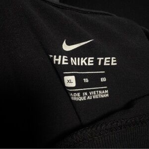 Black Nike short-sleeve tee featuring a white graphic at the lower hem. Crew neckline and relaxed silhouette. Simple sporty look for everyday wear.