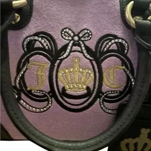 Elegant Juicy Couture satchel with a bold purple and black design. Features gold accents and a chic emblem.