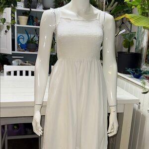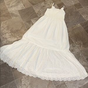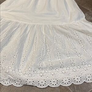 Lightweight white maxi dress with a smocked bodice. Thin shoulder straps and a square neckline. Flowing skirt with eyelet tiered hem. Breezy and casual for warm days.
