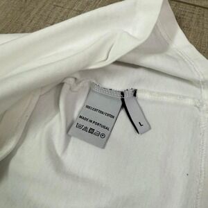Standout streetwear graphic tee from Unique Clothing. White base with bold green and black thorn-style lettering for an edgy vibe. Made in Portugal from 100% cotton – soft, breathable, and durable. Size tag says L with a relaxed fit that works well for oversized styling too.
