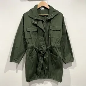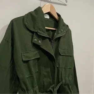The Lovers + Friends Monet Jacket is of a relaxed fit and mid length which is perfect for styling as a dress or coat. This army green utilitarian jacket features front flap pockets, gunmetal hardware, a self-tie wasit belt and a zip up closure. Made from 100% cotton (main). 100% rayon (pocket lining).