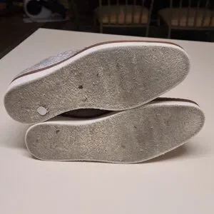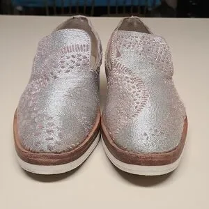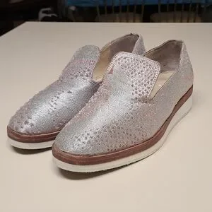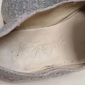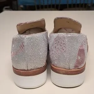 Free People Snake Eyes slip on casual loafer. Silver metallic knit fabric upper with Mauve velvet embroidered accent. Features Tan trim and platform mid sole. Size 39 with light surface wear but otherwise in great used condition.