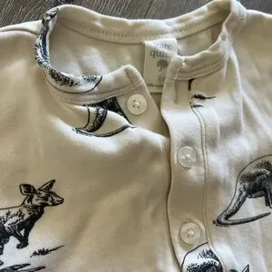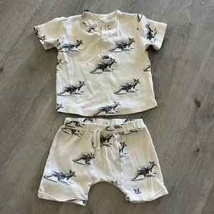 Soft knit two-piece set with kangaroo print. Short sleeve henley top with matching drawstring shorts. Comfortable and casual style for play. Easy to mix and match. I don't see any stains in GUC.