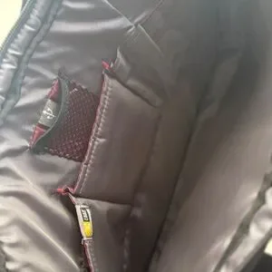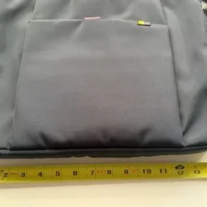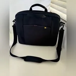 Case Logic black computer back with removable and adjustable strap. It has a front pocket with velcro closure. The back side has a strap with velcro. Top zipper closure with internal pockets for cables, phone, etc. In excellent condition.