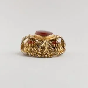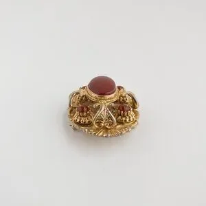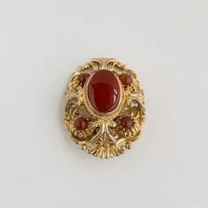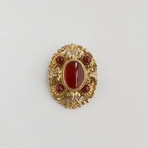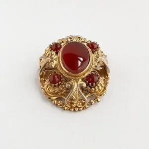 Gold tone metal domed brooch intricately designed and set with carnelian brown-red glass cabochons and a large poured glass stone at the centre