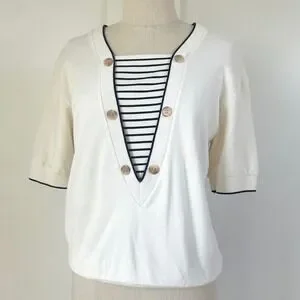 Conjure up a nautical daydream with this preppy Aileen Petites top. A classic cream canvas meets bold black stripes and refined navy trim, creating a piece that's both timeless and fresh. The unique button-front V-neck design adds a touch of sophistication, while the soft knit fabric ensures all-day comfort. Imagine yourself strolling along the boardwalk, enjoying a seaside brunch, or simply adding a touch of nautical flair to your everyday style.