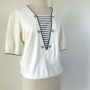Keywords: Aileen Petites, Sailor Top, Striped Top, Nautical Top, Button Top, Cream Top, Black Top, Short Sleeve Top, Casual Top, Cute Top, XS Top, Petite Top, Vintage Top