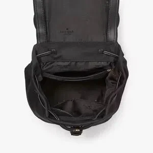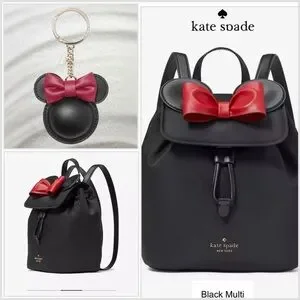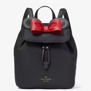 Chic black backpack by Kate Spade featuring a bold red bow. Ideal for daily wear and Disney trip.