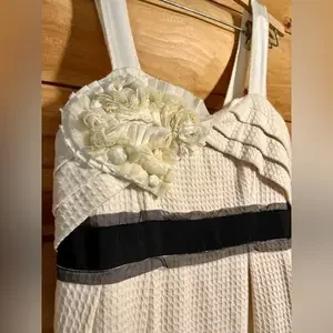 Date night? YES! Brunch? Also YES! This dress is as unique as it is versatile! Soft comfy 100% cotton waffle textured material. Timeless black and cream color combo. The detailing in the corsage is stellar and the dainty waistband is a crisp, ultra feminine detail. Top it all off with…POCKETS! This dress is in like new condition. No spots, stains or signs of wear.