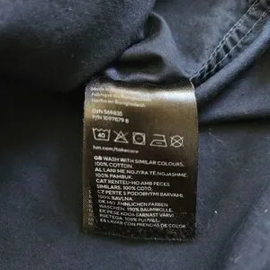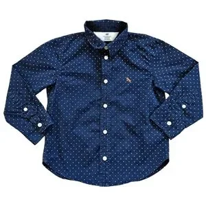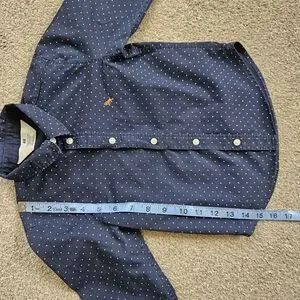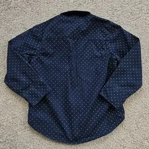 H&M boy's long sleeved button up dress shirt. Size 4T. Navy blue with polka dot print. 100% cotton. Good used condition, the only flaw to note is a very small spot on the sleeve which is shown in photos-not noticable, in my opinion. Well made, good quality material!