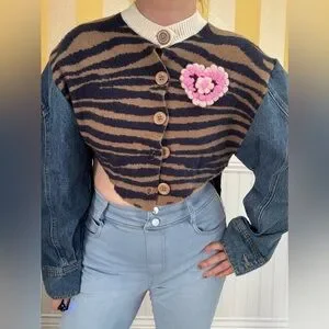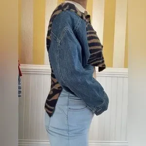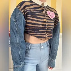 Stylish cropped jacket featuring a unique striped pattern and denim sleeves. Unique abstract pattern+expensive boho vibe!