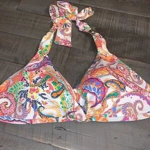 Embrace vibrant summer style with this stunning Lauren Ralph Lauren halter bikini top. The eye-catching paisley print in a kaleidoscope of colors, including bright pinks, oranges, blues, and greens, evokes a playful and energetic vibe. Designed with a flattering halter neckline and adjustable ties, this top offers a customizable and secure fit for all-day comfort. Perfect for beach days, poolside lounging, or tropical vacations.