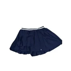 A navy high-rise tennis skort measuring 15 inches in length. This skort features a pleated design and built-in shorts for comfortable wear. The elastic waistband is accented with white stripes, adding a sporty touch. A subtle CALIA logo is visible on the lower front panel. Perfect for tennis matches, workouts, or casual athleisure wear.