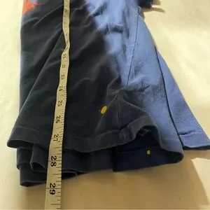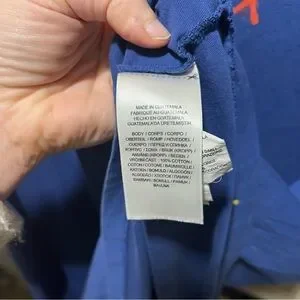 Stylish blue tee with bold red logo. Perfect for casual wear. Has intentional paint splatter design. Classic fit, size large and in good preowned condition.