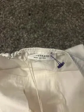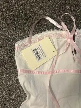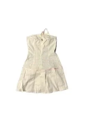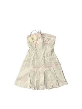Peppermayo Candy Coated Bustier Mini Dress in White with Pink Ribbon details, Size US 2. This adorable coquette-style mini dress features a structured bustier top, delicate lace trim, and contrasting pink satin ribbon accents. The skirt has a pleated drop-waist design for a flirty silhouette. Excellent new with tags condition. Perfect for summer parties, festivals, or a dollette aesthetic.