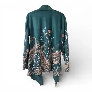 soft surroundings jacket, faux suede jacket women, paisley jacket women, waterfall jacket women, open front jacket women, boho jacket women, lagenlook jacket women, art to wear jacket, drape cardigan jacket, embossed suede jacket, emerald green jacket women, artistic jacket women, travel layering jacket