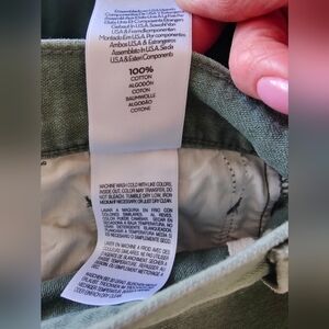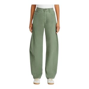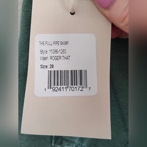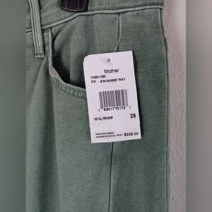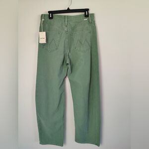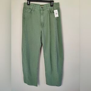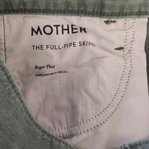 The product is a pair of Mother Denim The Full Pipe Skimp jeans in a size 28 that fits like size 29. It is recommended to size down in this style of Mother denim. These jeans feature a solid green color, made of 100% cotton. They have a high rise and a relaxed fit, with a wide-leg style and pockets. The jeans are designed for women and have a zip and button closure, with a 31-inch inseam. The brand is Mother, known for its stylish and comfortable jeans.