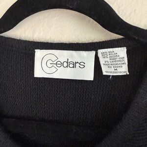 Vintage Cedars novelty sweater featuring a captivating blend of elegance and statement style. The black knit backdrop serves as the perfect canvas for the ornate gold embellishments, including stylized floral appliqués, rope detailing, and beaded accents. Dolman sleeves add a touch of sophistication and comfort. This unique piece is perfect for holiday gatherings, costume parties, or adding a touch of vintage glamour to your evening wear.