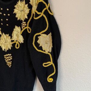 Keywords: vintage sweater, gold embellished, floral sweater, knit sweater, novelty sweater, party sweater, statement sweater, black sweater, dolman sleeve, retro sweater, 80s sweater, cedars sweater, beaded sweater, Occasion, Event, NYE, Holiday, Glam, Bling, Artsy, Avant Garde, Rare, Eclectic, Wacky, Unique, Maximalist,