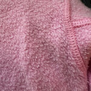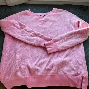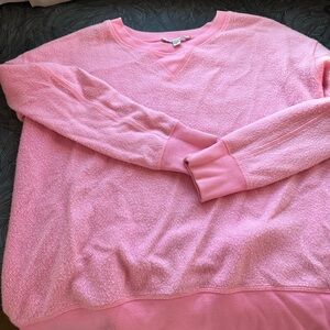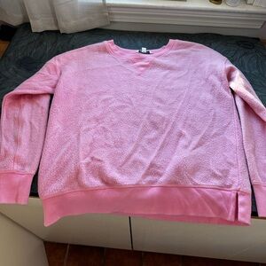Soft-textured pink crewneck pullover. Relaxed silhouette with ribbed cuffs and hem. Cozy, plush fabric ideal for everyday wear. Simple, versatile piece for layering.