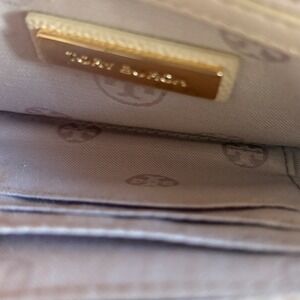 Elegant "Gigi" clutch by Tory. Refined beige pebbled leather exterior. Accentuated by a signature gold-tone Tory Burch logo on the front flap. Envelope style design with interior Tory Burch logo fabric. Provides enough space for essentials.