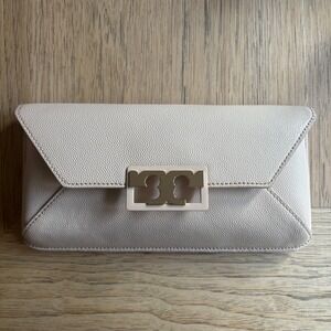 Tory Burch, Gigi clutch, handbag, beige, pebbled leather, envelope clutch, flap clutch, gold logo, designer bag, evening bag, party clutch, women's clutch, formal clutch, neutral clutch, Tory Burch bag