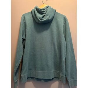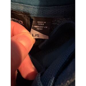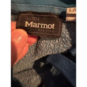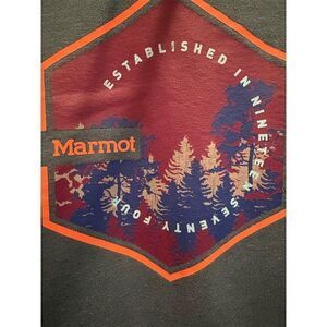 Keywords: Marmot, men's hoodie, large, green, pullover, fleece, graphic logo, drawstring, cotton, polyester, fall, casual, machine washable, used condition.