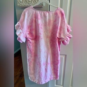 Chic pink tunic with playful ruffle sleeves. Tie-dye pattern adds a trendy touch. Perfect for casual wear. Very nice preloved condition. Measurements are approximate.