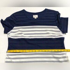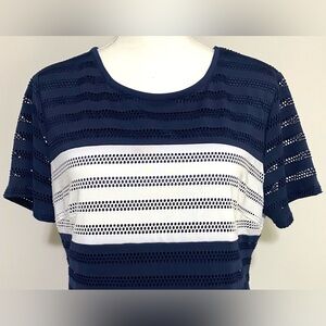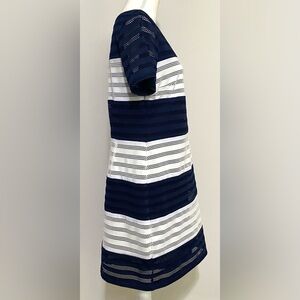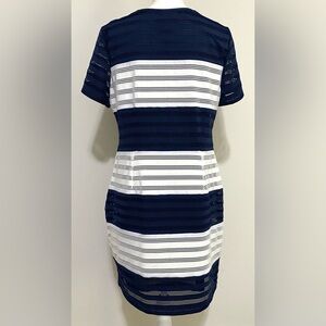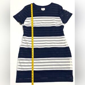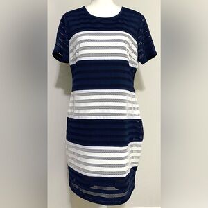 Beige by ECI Womens L Navy Blue White Stripe Short Sleeve Straight Dress Classic