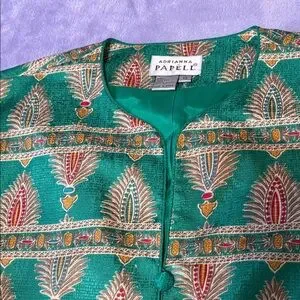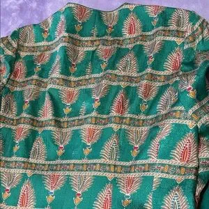 Elegant green jacket and skirt set. Features intricate gold patterns. Perfect for formal occasions. 2-piece set, pre-owned. Measurements are in the photos.