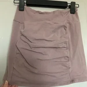 Soft mauve ruched skirt with a flattering fitted silhouette. Stretch fabric offers comfortable all-day wear. Subtle ruching adds texture and a chic touch. Easy to pair for casual or dressy looks.